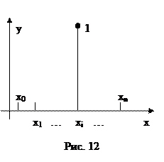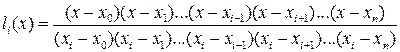 Необходимо, чтобы каждый многочлен li(x) обращался в нуль во всех узлах интерполяции, за исключением i -го, в котором он равен 1 (Рис. 12). Если li(x) удовлетворяет таким условиям, то в i -ом узле интерполяции многочлен Ln(x) примет значение yi, что удовлетворяет условию поставленной задачи. Таким условиям удовлетворяет многочлен вида:
