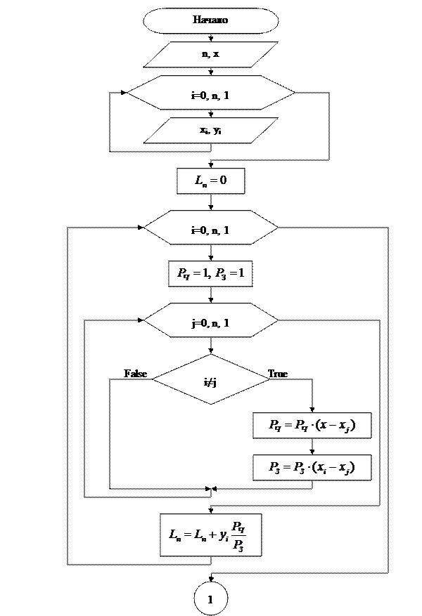 С использованием формулы (51) построим блок-схему алгоритма метода интерполяции функции полиномом Лагранжа.