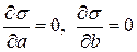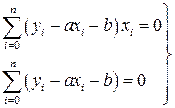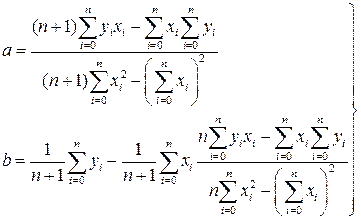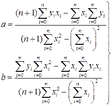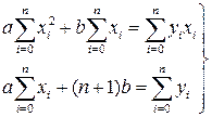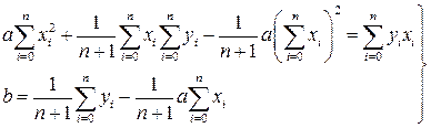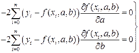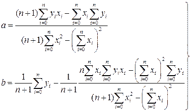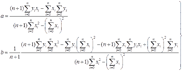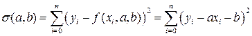 Рассмотрим подробнее метод наименьших квадратов на примере линейной регрессии, т.е. общий вид функции такой: f(x)=ax+b. Требуется найти методом наименьших квадратов коэффициенты a и b. Для определения минимального σ необходимо приравнять нулю частные производные этой функции по параметрам a и b. Для случая линейной регрессии формула (52) приводится к следующему виду: