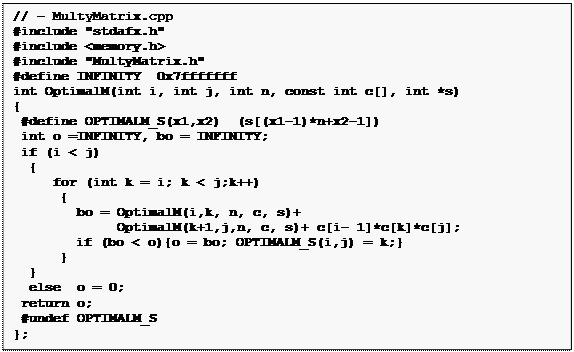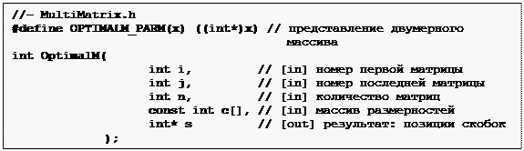 Функция OptimalM имеет четыре входных параметра: i (номер первой матрицы), j (номер последней матрицы), n (общее количество перемножаемых матриц), c (массив размерностбю n, содержащий размерности матриц), а также один выходной параметр s (двумерный массив размерностью n, содержащий точки разрыва). Кроме того, к точке вызова возвращается минимальное количество операций умножения, необходимых для перемножения матриц заданной размерности.