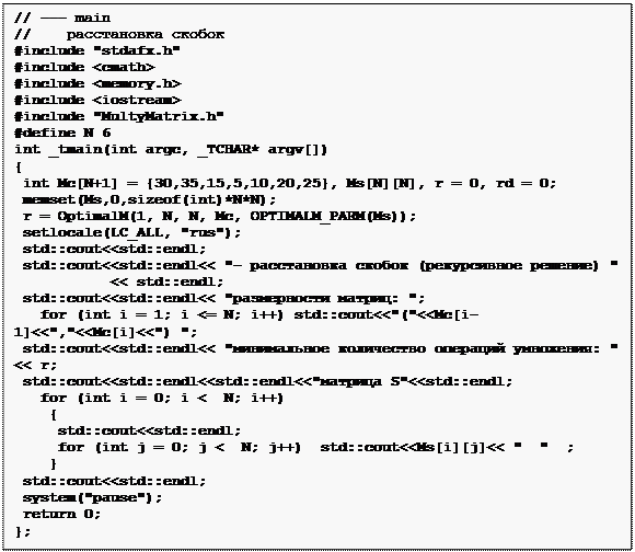 На рис. 11 приведен пример программы, вызывающей функцию OptimalM для оптимальной расстановки скобок при перемножении шести матриц, а на рис. 12 – результат выполнения этой программы.