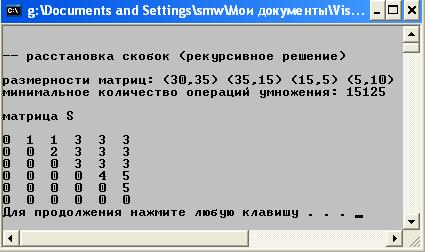 Расстановку скобок в заданной последовательности матриц можно осуществить с помощью двумерного массива s, возвращаемого функцией в последнем параметре. Поясним принцип использования этого массива для расстановки скобок при перемножении шести матриц