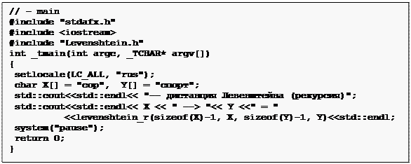 В программе, приведенной на рис. 18, вызывается функция levenshtein_r для вычисления дистанции Левенштейна между строками «сор» и «спорт».