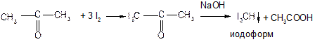 По a-СН-китслотному центру альдегиды и кетоны вступают в реакцию с галогенами. Если в субстрате содержится три атома водорода на a-СН-кислотном центре, образуется галоформ (с хлором – хлороформ, с иодом – иодоформ). Реакция имеет характерные признаки и используется для идентификации метилкетонов и этаналя.
