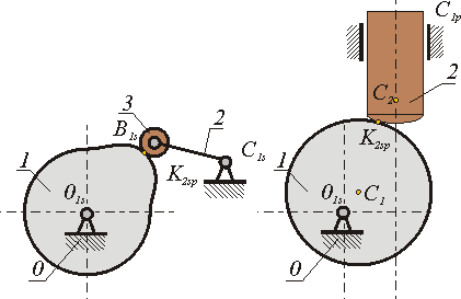 Первый этап синтеза - структурный. Структурная схема определяет число звеньев механизма; число, вид и подвижность кинематических пар; число избыточных связей и местных подвижностей. При структурном синтезе необходимо обосновать введение в схему механизма каждой избыточной связи и местной подвижности. Определяющими условиями при выборе структурной схемы являются: заданный вид преобразования движения, расположение осей входного и выходного звеньев. Входное движение в механизме преобразуется в выходное, например, вращательное во вращательное, вращательное в поступательное и т.п. Если оси параллельны, то выбирается плоская схема механизма. При пересекающихся или перекрещивающихся осях необходимо использовать пространственную схему. В кинематических механизмах нагрузки малы, поэтому можно использовать толкатели с заостренным наконечником. В силовых механизмах для повышения долговечности и уменьшения износа в схему механизма вводят ролик или увеличивают приведенный радиус кривизны контактирующих поверхностей высшей пары.