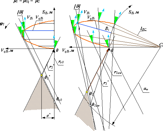 Выбор центра возможен в заштрихованных областях. Причем выбирать нужно так, чтобы обеспечить минимальные размеры механизма. Минимальный радиус r1* получим, если соединим вершину полученной области, точку О1*, с началом координат. При таком выборе радиуса в любой точке профиля на фазе удаления угол давления будет меньше или равен допустимому. Однако кулачок необходимо при этом выполнить с эксцентриситетом е*. При нулевом эксцентриситете радиус начальной шайбы определится точкой Ое0. Величина радиуса при этом равна re0, то есть значительно больше минимального. При выходном звене - коромысле, минимальный радиус определяется аналогично. Радиус начальной шайбы кулачка r1aw при заданном межосевом расстоянии aw, определяется точкой О1aw, пересечения дуги радиуса aw с соответствующей границей области. Обычно кулачок вращается только в одном направлении, но при проведении ремонтных работ желательно иметь возможность вращения кулачка в противоположном направлении, то есть обеспечить возможность реверсивного движения кулачкового вала. При изменении направления движения, фазы удаления и сближения, меняются местами. Поэтому для выбора радиуса кулачка, движущегося реверсивно, необходимо учитывать две возможных фазы удаления, то есть строить две диаграммы S В= f (j1) для каждого из возможных направлений движения. Выбор радиуса и связанных с ним размеров реверсивного кулачкового механизма проиллюстрирован схемами на рис. 17.6.