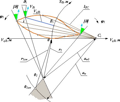 Условие, которому должно удовлетворять положение центра вращения кулачка О 1: углы давления на фазе удаления во всех точках профиля должны быть меньше допустимого значения. Поэтому графически область расположения точки О 1 может быть определена семейством прямых проведенных под допустимым углом давления к вектору возможной скорости точки центрового профиля, принадлежащей толкателю. Графическая интерпретация вышесказанного для толкателя и коромысла дана на рис. 17.5. На фазе удаления строится диаграмма зависимости S B = f(j1). Так как при коромысле точка В движется по дуге окружности радиуса lBC , то для механизма с коромыслом диаграмма строится в криволинейных координатах. Все построения на схеме, проводятся в одном масштабе, то есть ml= mVq= mS.