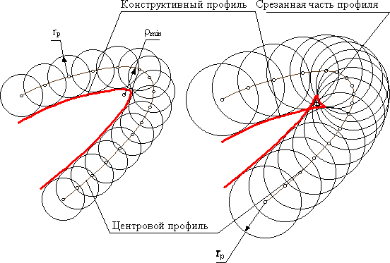 - проводятся из произвольных точек выбранных равномерно по центровому профилю кулачка дуги окружностей радиуса rp.