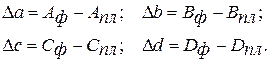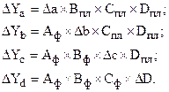 Рассмотрим алгоритм расчета для мультипликативной факторной модели типа Y=a´b´c´d. Имеются плановые и фактические значения по каждому факторному показателю, а также их абсолютные отклонения: