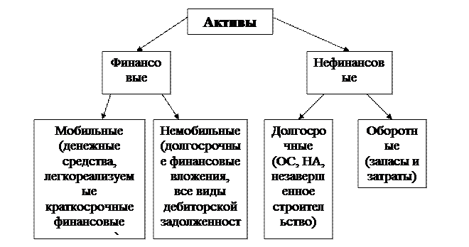 Финансовые активы в свою очередь делятся на немобильные и мобильные. Мобильные финансовые активы — это высоколиквидные активы (денежные средства и легкореализуемые краткосрочные финансовые вложения). Немобильные финансовые активы включают долгосрочные финансовые вложения, все виды дебиторской задолженности, срочные депозиты.