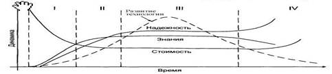 Интересна закономерность развития надежности технических решений. График надежности технических решений отстает от графиков стоимости и уровня знаний. Новая технология в руках неквалифицированных пользователей не может быть основой надежной работы системы связи. По мере развития самой технологии и стабилизации опыта ее использования надежность технических решений повышается, достигая локального максимума. Дальнейшее повышение надежности в период старения технологии связано с известным статистическим процессом "что сломалось, то уже сломалось, а что работает, то и будет продолжать работать" даже при отсутствии запасных частей