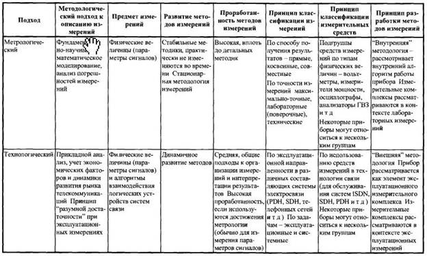 • технологический подход использует достижения современной метрологии при измерении параметров сигналов современных телекоммуникационных систем. В то же время само понятие измерений при технологическом подходе является более широким и включает также анализ протоколов взаимодействия логических устройств в сети;