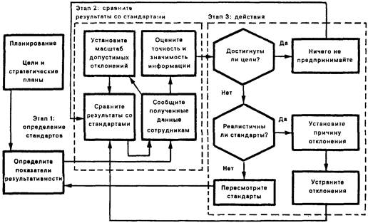 Часто случается так, что система контроля указывает на необходимость пересмотра планов. Успешно действующие организации зачастую вынуждены пересматривать свои стандарты в сторону повышения. Кроме того, временами оказывается, хотя это и не должно происходить слишком часто, — что планы составлены чересчур оптимистично. Поэтому стандарты подчас надо пересматривать и в сторону понижения. Стандарты, требования которых выполнить очень трудно, фактически, делают тщетными стремления рабочих и менеджеров достичь сформулированных целей и сводят на нет всю мотивацию. Как и в случае с корректирующими действиями различного типа, необходимость радикального пересмотра стандартов (в сторону повышения или понижения) может служить симптомом проблем, возникших либо в процессе собственно контроля, либо в процессе планирования. На рис.5. дана полная модель процесса контроля.