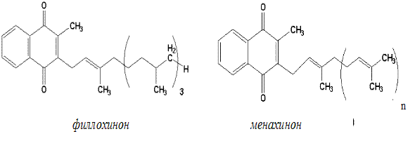 Витамин К – это 2 группы хинонов с боковыми изопреноидными цепями: витамин К1 (филлохиноны) и витамин К2 (менахиноны). Филлохиноны открыты в растениях, а менахиноны имеется также и у животных. Они различаются строением и количеством изопреновых единиц в боковой цепи.
