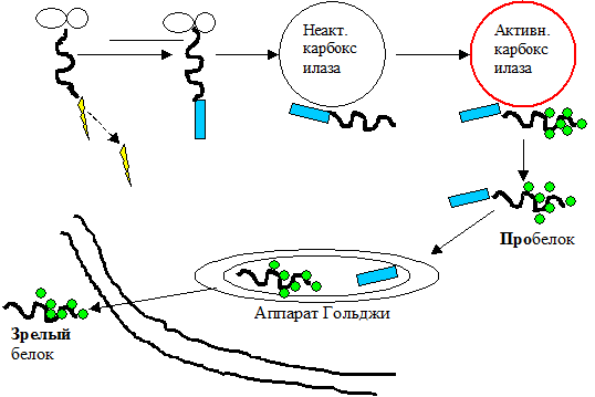 Витамин К-зависимые белки синтезируются в эндоплазматическом ретикулуме в виде белков-предшественников, содержащих сигнальный участок и «участок узнавания» для γ-карбоксилирования. После отщепления сигнального пептида белок с помощью «участка узнавания» связывается с витамин К-зависимой карбоксилазой, локализующейся в мембранах эндоплазматического ретикулума. В результате этого связывания γ-карбоксиглутаматкарбоксилаза переходит из неактивного состояния в активное и начинает осуществлять каталитическое превращение остатка глутаминовой кислоты в γ-карбокси-глута-миновую кислоту в витамин К-зависимом про белке. Карбоксилированный пробелок перемещается в сетчатый аппарат Гольджи, где расщепляется и зрелая белковая молекула секретируется клеткой в межклеточное пространство (см. рис.). На N-конце зрелого протромбина и других К-зависимых белков содержится 10-12 остатков γ-карбоксиглутаминовой кислоты. Домены с таким участками высоко структурированы и заключают в себе линейно расположенные ионы кальция.