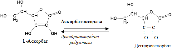 Метаболизм. Аскорбиновая кислота всасывается путём простой диффузии на всём протяжении желудочно-кишечного тракта, но преимущественно это происходит в тонком кишечнике. В крови и тканях она связывается с различными высокомолекулярными соединениями белковой и небелковой природы. Дегидроаскорбиновая кислота, образующаяся в клетках из аскорбиновой кислоты ферментом аскорбатоксидазой, является неустойчивым соединением и легко окисляется в водной фазе с образованием 2,3-дикетогулоновой кислоты, которая уже не обладает витаминной активностью. Восстановление дегидроаскорбиновой кислоты в аскорбиновую осуществляется дегидроаскорбатредуктазой с участием глутатиона-SH. Конечными продуктами деградации витамина С являются щавелевая, треоновая, ксилоновая и ликсоновая кислоты. Аскорбат и продуты его распада экскретируются с мочой.