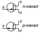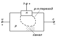 Принцип действия полевого транзистора с p-n-переходом основан на изменении сечения канала и тем самым его сопротивления от запирающего напряжения на p-n-переходе. Канал выполняется из полупроводника с высоким удельным сопротивлением за счёт малой концентрации примеси. Затвор – наоборот – с высокой концентрацией примеси в полупроводнике.