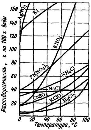 Изменением растворимости с температурой часто пользуются для очистки веществ путем перекристаллизации. При остывании горячего насыщенного раствора какой-либо соли, загрязненной посторонними примесями, значительная ее часть (соли) выделится в виде осадка, а загрязняющие примеси останутся в растворе, так как последний даже на холоде по отношению к ним не будет насыщенным.