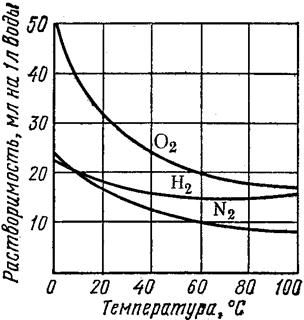 Растворимость газов уменьшается с повышением температуры. Длительным кипячением можно почти полностью удалить растворенные газы из жидкости. Насыщение же жидкости газом, наоборот, целесообразнее проводить при низких температурах.