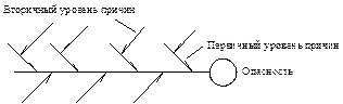 Следующий этап проектирования систем безопасности – идентификация (определение) опасностей. В результате получают перечень опасностей. Затем строят дерево «причин и опасностей» (диаграмма Исикавы (смотри рисунок)), для конкретизации причин опасностей. Далее делают количественную и качественную оценку опасностей, сравнивают с допускаемыми значениями и уровнем риска. В результате получают перечень причин и опасностей, от которых необходима защита. Анализируя этот перечень, количественно определяют параметры условий труда, которые должны быть достигнуты, и производится комплексная оценка объектов по параметрам безопасности, при этом принимаются интегральные или бальные показатели. После этого переходят к анализу возможных принципов, методов и средств обеспечения безопасности. Производят анализ достоинств и недостатков, потерь и выгод по каждой альтернативе, рассчитывают приемлемые варианты. Последним этапом проектирования систем безопасности является оценка эффективности, т.е. расчет показателей технического, социального, экономического эффектов.