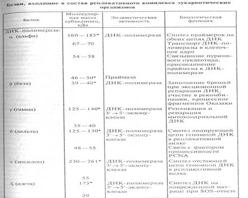 ДНК-полимеразы эукариот. В клетках эукариот имеются по меньшей мере шесть различных ДНК-зависимых ДНК-полимераз: α, β, δ,ε,γ,ζ. Четыре из них — α, β, δ,ε — непосредственно участвуют в репликации хромосомной ДНК (табл. 18).