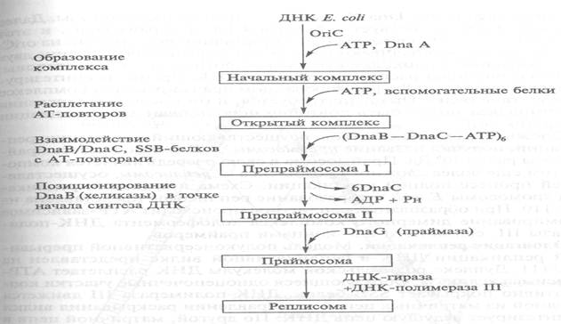 Хромосома Е. coli содержит единственную область начала репликации (oriC), размер которой составляет 258 н.п. В oriC имеется пять консенсусных девятинуклеотидных сайтов связывания инициаторного белка Dna А, названных Dna А-боксами. В левой части oriC наряду с Dna А распознает область начала репликации и образует комплекс с други-ми белками.Сначала белок Dna А в комплексе с АТР взаимодействует с Dna А-боксами. С помощью электронной микроскопии исходный комплекс обнаруживается в виде компакт-ной эллипсоидной структуры, содержащей -20 мономеров Dna А, которая закрывает oriC. В этом комплексе частично расплетаются АТ-богатые повторы и формируется открытый комплекс. В этом процессе участвуют некоторые вспомогательные белки, которые помогают инициатору Dna А раскручивать и изгибать ДНК (ранее они обозначались n, n', n", i, а. В последнее время их обозначают IME, FIS-факторы и т.д.).