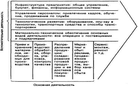 «Цепочка ценностей» дает представление о стратегически связанных видах деятельности предприятия и позволяет проследить процесс создания стоимости. В «цепочке ценностей» деятельность предприятия подразделяется на два типа: