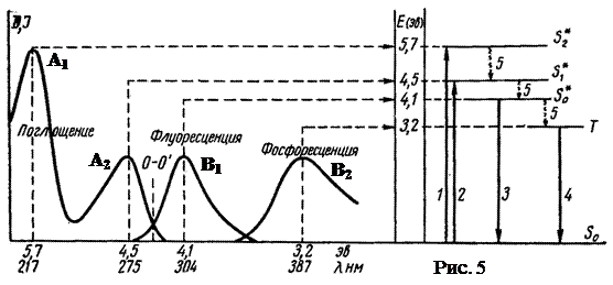 ). Продолжительность жизни молекулы в триплетном состоянии от 10-3 до нескольких секунд, т.к. прямой спонтанный переход электрона с уровня Т на основной уровень S0 невозможен. Это связано с тем, что ориентация спинов электронов на Т и S0 уровнях одинакова. Правила запрета такие переходы не разрешают. Люминесценция, которая возникает при переходе электронов с Т на S0 уровень, называется фосфоресценцией (переход 4, рис.5).