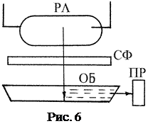 На рис.6 показана схема флуоресцентного макроанализа. Ультрафиолетовое излучение от ртутной лампы (РЛ) направляется на объект (ОБ) и возбуждает его люминесценцию. Свет люминесценции поступает в приёмник (ПР) – глаз, фотоэлемент, фотопластинка, фотоумножитель, где регистрируется. Чтобы видимый свет источника не накладывался на свет люминесценции, применяют светофильтр СФ, пропускающий к объекту только невидимые глазом ультрафиолетовые лучи.