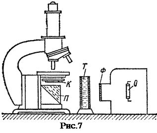 Установка для люминесцентной микроскопии (рис.7) состоит из ртутной лампы О, светофильтра Ф, пропускающего только ультрафиолетовое излучение, теплового фильтра Т, кварцевой призмы П, и конденсора К с кварцевыми линзами. Исследуемый препарат располагается на кварцевом или увиолевом предметном стекле. Оптическая часть микроскопа выполнена из обычного стекла, т.к. через неё проходит видимый свет, возникший в результате флуоресценции. Люминесцентная микроскопия используется при изучении флуоресцирующих естественных препаратов или окрашенных флуоресцирующей краской.