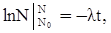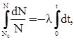 Выражение (4) представляет собой дифференциальное уравнение 1-го порядка с разделяющимися переменными. Знак «–» в (3) указывает на убывание величины N с течением времени. Решим это уравнение, используя начальные условия: в начальный момент времени t = 0, N = N0 – первоначальному числу ядер: