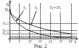 В заключение отметим, что для каждого радионуклида период полураспада – величина постоянная и не может быть изменена никаким внешним воздействием. На рис.2 представлены графики закон радиоактивного распада двух радионуклидов, периоды полураспада которых находятся в соотношении Т2 = 2Т1.