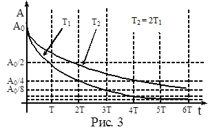 График зависимости активности от времени аналогичен графику закона радиоактивного распада (рис.3).