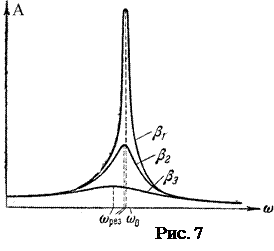 Приведенные на рис.7 графики, которые называют резонансными кривыми, отличаются значением коэффициента затухания, действующего в колебательной системе. С уменьшением значения β, резонансные кривые становятся все острее, а величина Арез все больше. Теоретически при β → 0 частота ωрез→ ω0, а амплитуда А → ∞.