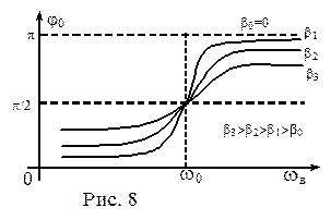 Как показывает сопоставление (22) и (25), вынужденные колебания тела отстают по фазе от колебаний вынуждающей силы на φ0. График зависимости φ 0 от ωв при различных значениях β приведен на рис.8.