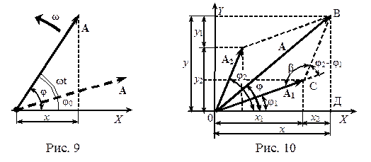Построим векторные диаграммы этих колебаний – вектора А1 и А2 (рис.10). Из рисунка видно, что проекция результирующего вектора А на ось Х: