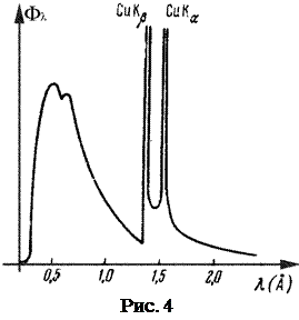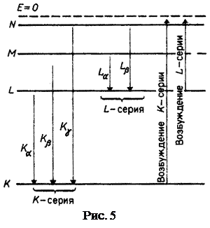 Cовокупность частот испускаемых при переходе на уровень К образует К-серию рентгеновского спектра (рис.5), линии которой в порядке возрастания частоты обозначаются индексами α, β, γ, δ, т.е. переходу