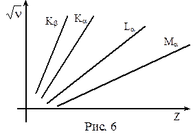 Мозли установил простой закон, связывающий частоты соответствующих спектральных линий с атомным номером материала анода:
