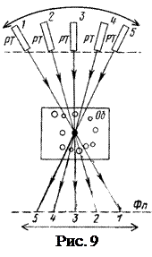 Томография – послойное исследование – дополнительный метод, позволяющий получить изображение определённого слоя изучаемой области, избежав суперпозицию теней, затрудняющих трактовку рентгенограмм. Используются специальные аппараты – томографы или томографические приставки к снимочному столу либо универсальному штативу. Во время проведения томогарфии пациент неподвижен, рентгеновская трубка и кассета с плёнкой перемещаются в противоположных направлениях (рис.9). Трубка и держатель кассеты укреплены на концах металлического коромысла томографической тягой, вращающейся вокруг горизонтальной оси. Положение оси в каждом конкретном случае изменяется с учётом уровня (глубины) исследуемой части тела. При горизонтальном положении больного на столе рентгеновского аппарата ось устанавливается на уровне слоя, изображение которого необходимо получить. В результате синхронного движения трубки и кассеты с плёнкой изображение всех анатомических деталей оказывается размазанным, кроме одного слоя, лежащего на уровне оси вращения тяги.