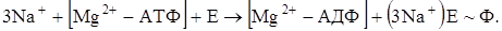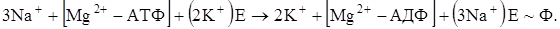 1. Связывание на внутренней поверхности мембраны субстратов: трех ионов Na+ и АТФ в комплексе с Mg2+. На этом этапе, активизируемом ионами Na+, происходит фосфорилирование фермента внутри клетки. В результате от комплекса [Mg2+-АТФ] остается комплекс [Mg2+-АДФ]: