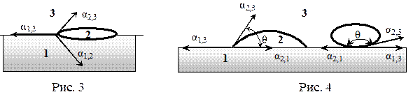 Капля более лёгкой жидкости 2, пущенная на поверхность жидкости 1, принимает форму линзы. К единице длины линии контакта жидкость-1 – жидкость-2 – газ будут приложены три силы численно равные коэффициентам поверхностного натяжения: α12 – по границе жидкость-1- жидкость-2; α23 – по границе газ – жидкость-2; α13 – по границе жидкость-1- газ. Силы α12 и α23 стремятся стянуть каплю 2 в сферу, а сила α13 , наоборот, растянуть каплю по поверхности жидкости 1. Если α13 > α23 + α12, то капля 2 неограниченно растекается по поверхности жидкости 1. Имеет место смачивание жидкости 1 жидкостью 2. Аналогичная ситуация будет иметь место на границе жидкость-твёрдое тело-газ (рис.4). Явления такого рода получили название краевых эффектов. Критерием этих состояний является так называемый краевой угол θ. Вершина угла θ лежит в точке на линии контакта всех трёх сред, а лучами являются касательные к поверхностям контактирующих тела. Если краевой угол θ острый, то имеет место смачивание. При тупом угле θ – несмачивание. Полное смачивание при θ = 00, несмачивание при θ = 1800.