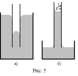 Лапласовское давление объясняет широкий круг капиллярных явлений. Эффект искривления поверхности жидкости у стенок особенно заметен в сосудах малого диаметра (трубка, щель). Если жидкость не смачивает стенки капиллярного сосуда, то форма поверхности (мениск) будет выпуклой (рис.5а), если смачивает, то вогнутой (рис.5б).