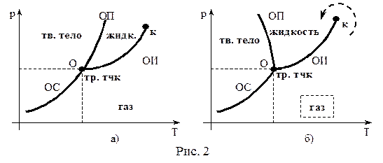 Точка О пересечения кривых определяет условия (значения Т и р), при которых все три агрегатные состояния вещества находятся в термодинамическом равновесии.