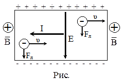 На (рис.) представлены направления движения зарядов, силы тока, вектора индукции магнитного поля В и возникающей при этом силы Лоренца F л. Действие силы Лоренца вызовет перемещение отрицательных зарядов к нижнему краю пластинки, соответственно положительных – к верхнему. В результате, возникает поперечное электрическое поле с напряженностью Е, которое будет препятствовать поперечному движению заряженных частиц. В некоторый момент кулоновская сила этого поля уравновесит силу Лоренца. При этом установится постоянное стационарное распределение зарядов в поперечном направлении. Определим поперечную (холловскую) разность потенциалов между краями пластинки. Из условия равновесия сил для металлов получим: