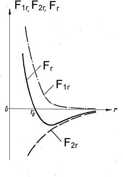 При r=r0 силы F1r и F2r взаимно уравновешиваются и результирующая сила Fr = 0. Если r >r0, то преобладают силы взаимного притяжения, если r < r0, - преобладают силы отталкивания.