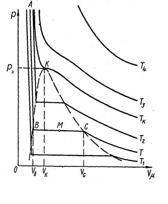Английский физик Т. Эндрюс эксперименгально исследовал зависимость молярного объема углекислого газ от давления при изотермическом сжатии (1866 г.). Результаты этих опытов в виде зависимостей в координатах давление - молярный объем (p-V μ) показаны на рис. 17.2 (Т1 <Т< Т2 <Tк <T3< Т4).