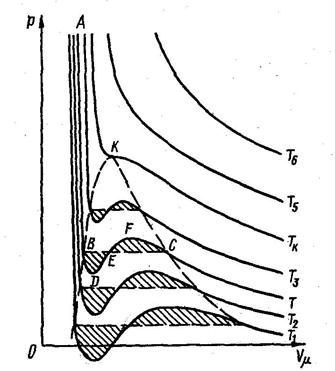 Изотермапри Т = Тк является критической, а точка К перегиба этой изотермы - критической точкой.