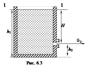 Пример 6.1. Применение уравнения Бернулли для расчета скорости истечения жидкости сквозь малое отверстие в стенке или дне сосуда. Рассмотрим сосуд, заполненный идеальной жидкостью. В боковой стенке его на глубине Н ниже уровня жидкости проделано малое отверстие (рис. 6.3).