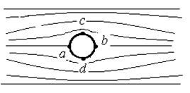 На рис. 5-5 показан вид линий тока идеальной жидкости, обтекающей длинный круговой цилиндр, ось которого расположена перпендикулярно к плоскости чертежа. Скорость жидкости отлична от нуля во всех точках поверхности цилиндра, за исключением критических точек а и b, в которых она равна нулю. На участках ас и ad скорость жидкости возрастает, а статическое давление убывает в соответствии с уравнением Бернулли. В точках с и d скорость максимальна, а давление минимально. На участках cb и db скорость убывает, а давление возрастает. Линии тока симметричны относительно плоскостей аb и cd. Поэтому результирующая всех элементарных сил давления жидкости на цилиндр равна нулю. Так как жидкость идеальная, то нет и сил трения, т. е.