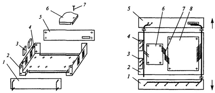К модулям второго уровня относятся блоки различных видов. Конструкция одноплатного бескаркасного настольного прибора со встроенным блоком питания приведена на рис. 5 и 6. Несущей конструкцией прибора является основание 2. Хотя размеры основания могут быть большими (300 х 450 мм и более), его обычно изготовляют из тонкого листового материала, а для придания жесткости в углах конструкции задается определенная форма.